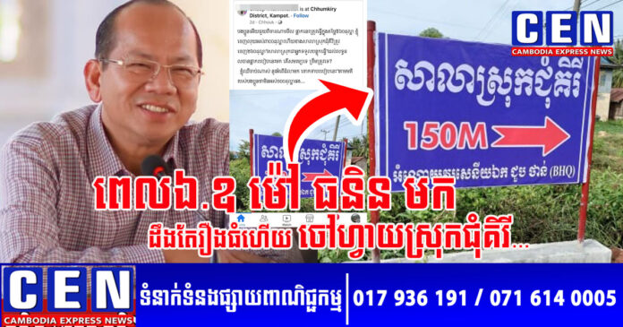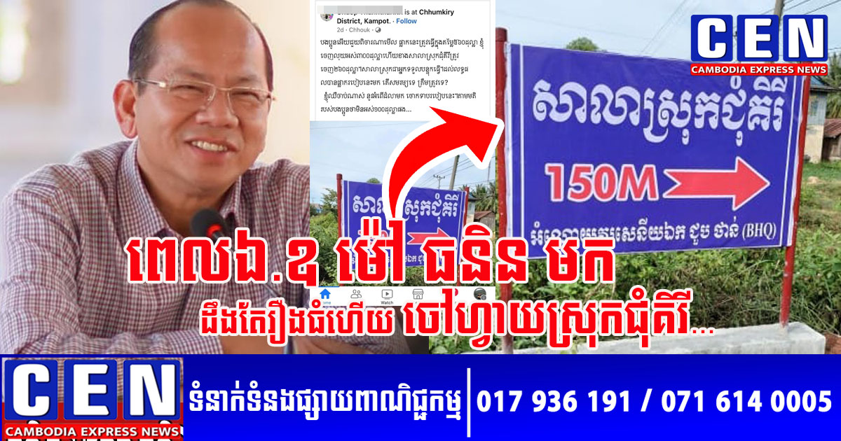 ជុំវិញរឿងធ្វើផ្លាកនេះ លោកបានប្រាប់ក្នុងខមិនឲ្យបងប្អូនមហាជនបានដឹងថា៖ «ខ្ញុំយល់ថាវាពិបាករកសាលាស្រុកណាស់ ព្រោះវានៅក្នុង រួចវានៅតាមខ្លោងទ្វារវត្តទៀត អ្នកធ្វើដំណើរពីខេត្តកំពត ឬពីភ្នំពេញរកសាលាស្រុកជុំគីរីមិនឃើញទេ អញ្ចឹងហើយបានជារួមគ្នាធ្វើផ្លាកមួយនេះទៅ។ ឯកភាពគ្នាធ្វើក្នុងតម្លៃ៥៦០ដុល្លារ បែរជាបានផ្លាករបៀបនេះទៅវិញ មិនយល់??????????????»។ ជាមួយគ្នានេះ លោកក៏បានបញ្ជាក់ឲ្យដឹងទៀតថា នៅពេលថ្ងៃចៅហ្វាយខេត្ត ឯកឧត្តម ម៉ៅ ធនិន មកស្រុកជុំគីរី លោកនឹងសួរចៅហ្វាយស្រុកម្តងហើយ ថោកទាបណាស់ លុយពីរបីរយក៏ត្របាក់ដែរ។