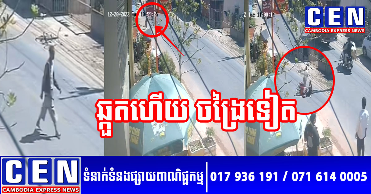 តាមរយៈវីដេអូកាមេរ៉ាសុវត្ថិភាព នៃហេតុការណ៍ដ៏ហួសចិត្តនេះដែលបានកើតឡើងនៅវេលាម៉ោង ១០ និង ៥៩ នាទី ថ្ងៃទី១២ ខែធ្នូ ឆ្នាំ២០២២ បានបង្ហាញឲ្យឃើញថា នៅមុនពេលបង្កគ្រោះថ្នាក់ គេបានឃើញបុរសជាមនុស្សឆ្កូតនោះ កំពុងបណ្តើរកង់ចេញពីផ្លូវខាងស្តាំ ឆ្លងទៅខាងឆ្វេង។ ប៉ុន្តែ ខណៈកំពុងបណ្តើរបានប៉ុន្មានម៉ែត្រ ឃើញម៉ូតូ១គ្រឿងបើកចូលមក ក៏ស្រាប់តែរុញកង់កាត់ខាងមុខ បណ្តាលឲ្យម៉ូតូដួលប្រាវតែម្តង។