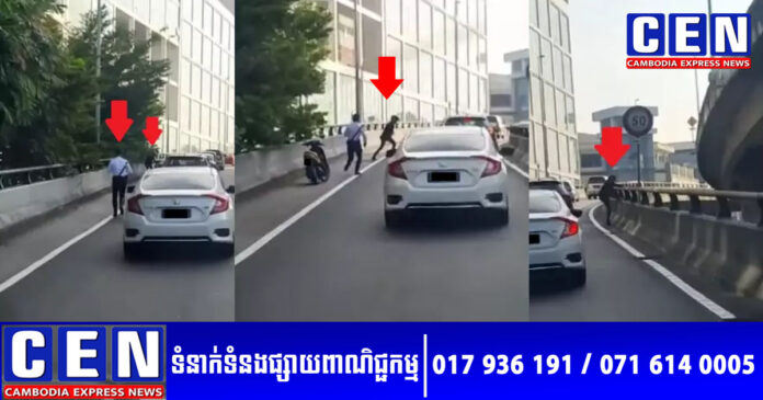 បើតាមរយៈវីដេអូឃ្លីប បានបង្ហាញបុរសម្នាក់ ជិះម៉ូតូបញ្ច្រាស់គេឯងនៅកណ្តាលស្ពាន ទាំងទទឹងទិស ហើយនៅពេលឃើញប៉ូលិស ក៏បានចុះពីម៉ូតូ រួចបណ្តើរត្រឡប់បកក្រោយវិញ ប៉ុន្តែ មិនដឹងម៉ូតូមិនឆេះ ឬយ៉ាងណា ភ័យស្លន់ពេក ទុកម៉ូតូចោល រួចប៉ុនប៉ងលោតចុះពីស្ពាន តែប្រហែលឃើញកម្ពស់ស្ពានខ្ពស់ពេក ក៏បានប្តូរចិត្តរត់ទៅផ្នែកខាងស្តាំ ប៉ុនប៉ងលោតចុះជាលើកទី២។