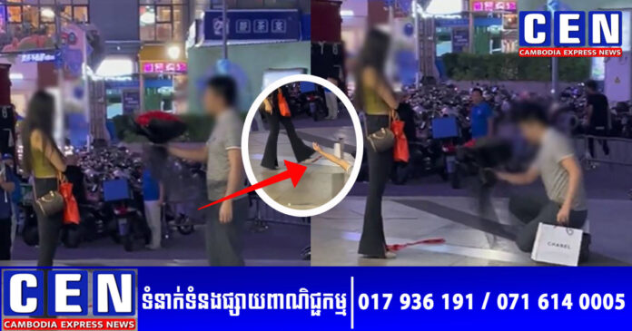 ជាក់ស្តែង ដូចករណីបុរសជនជាតិចិនម្នាក់នេះ ដែលរៀបចំធ្វើការ surprise ស្នើសុំនារីម្នាក់នៅមុខផ្សារទំនើបធំមួយក្នុងតំបន់ស្វយ័ត Nanning Guangxi Zhuang ប្រទេសចិន កាលពីពេលកន្លងទៅថ្មីៗនេះ ដោយគាត់បានរង់ចាំរហូតដល់នារីដែលគាត់ស្រលាញ់ដើរចេញពីផ្សារ ខណៈត្រៀមរួចស្រេចនូវបាច់ផ្កាដ៏ធំ និងកាបូបម៉ាកល្បីៗ ដោយសង្ឃឹមថាមិត្តស្រីនឹងពិតចិត្ត តែមានឯណា បានត្រឹមខកចិត្តខ្លាំងប៉ុណ្ណោះ។
