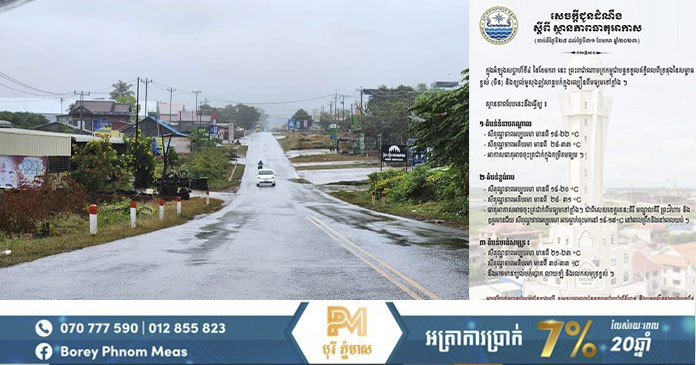 - ធាតុអាកាសអាចចុះត្រជាក់ពីមធ្យមទៅខ្លាំង។ ជាពិសេសខេត្តរតនគិរី មណ្ឌលគិរី ព្រះវិហារ និងឧត្តរមានជ័យ សីតុណ្ហភាពអប្បបរមា អាចធ្លាក់ចុះមកនៅ ១៥-១៧°C នៅពេលព្រឹក និងនៅពេលយប់។