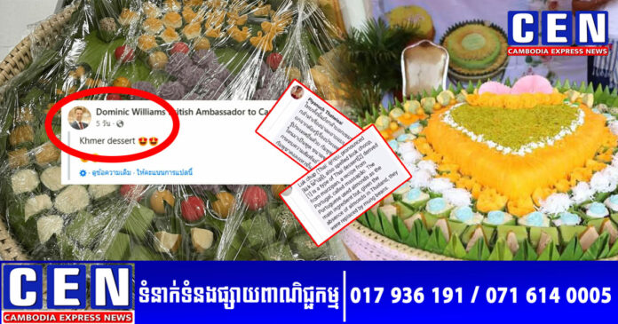 ប៉ុន្មានថ្ងៃនេះ មានរឿងក្តៅគគុកមួយបានផ្ទុះឡើង ខណៈជនជាតិថៃជាច្រើន បានបង្ហាញអារម្មណ៍មិនសប្បាយចិត្តយ៉ាងខ្លាំង ទៅនឹងឯកអគ្គរាជទូតអង់គ្លេសប្រចាំនៅកម្ពុជា លោក Dominic Williams ដែលបានបង្ហោះរូបថតមួយសន្លឹកបង្ហាញ «នំបង្អែម» ជាច្រើនមុខ នៅលើទំព័រហ្វេសប៊ុកផ្លូវការរបស់លោក ដោយបានដាក់ចំណងជើងថា «បង្អែមខ្មែរ (Khmer dessert)»។