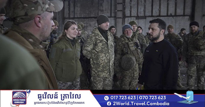 រដ្ឋធានីកៀវ៖ រហូតមកដល់ពេលនេះ ថ្វីបើការវាយប្រយុទ្ធគ្នាយ៉ាងសាហាវ រវាងកងទ័ពអ៊ុយក្រែន និង ទាហានរុស្ស៊ី កំពុងតែក្រាញននៀល នៅទីក្រុងបាកមូ យ៉ាងណាក្ដី ប៉ុន្ដែប្រធានាធិបតី លោក វ៉ូឡូឌីមៀរ ហ្សេឡែនស្គី នៅតែបន្ដធ្វើដំណើរ ទៅសួរសុខទុក្ខដល់កងកម្លាំងរបស់ខ្លួន នៅសមរភូមិប្រយុទ្ធដ៏ក្ដៅគគុកដដែល។