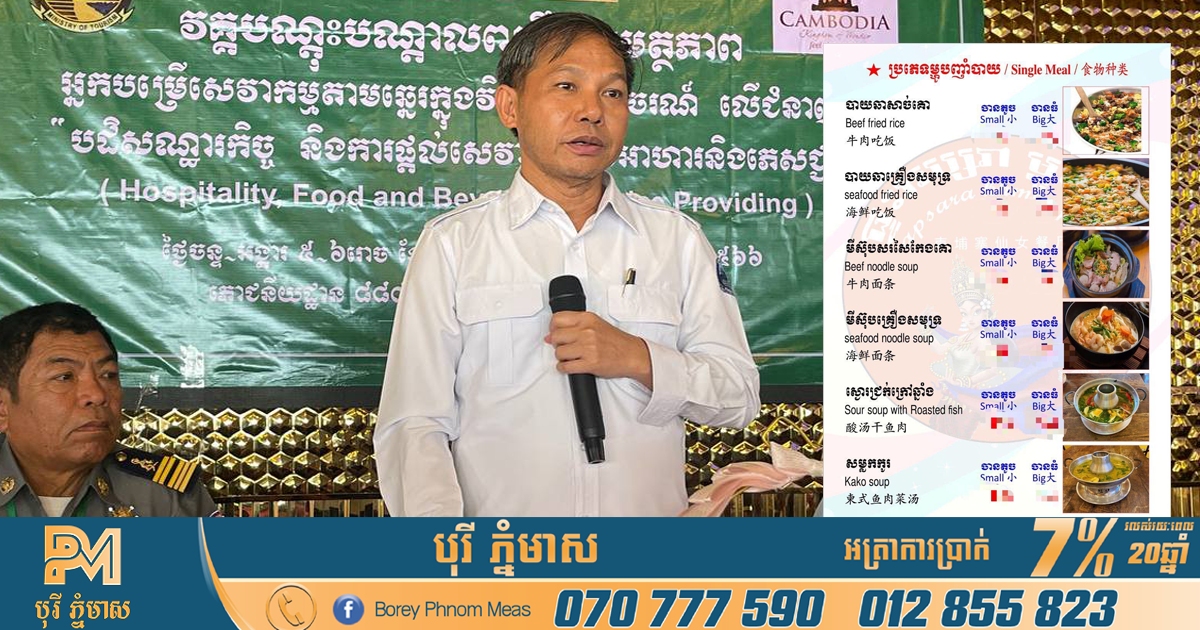 ក្នុងឱកាសបិទវគ្គបណ្តុះបណ្តាល បដិសណ្ឋារកិច្ច និងការផ្តល់សេវាកម្មម្ហូបអាហារ និងភេសជ្ជៈ លោក តាំង សុចិត្តគ្រឹស្នា ប្រធានមន្ទីរទេសចរណ៍ខេត្តព្រះសីហនុ បានណែនាំទៅដល់ម្ចាស់អាជីវកម្មតាមតំបន់ឆ្នេរអំពីការដាក់តម្លៃឱ្យបានត្រឹមត្រូវ មានភាពងាយស្រួលដល់ភ្ញៀវដែលមកទទួលទានក្នុងហាងរបស់ខ្លួន។