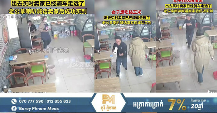 ពេលប្ដីឃើញដូច្នេះ ក៏ប្រញាប់ដើរទៅយកមេក្រូបំពងសំឡេង ហើយស្ទុះរត់ចេញទៅខាងមុខហាងយ៉ាងប្រញាប់ និងស្រែកហៅអ្នកលក់ពោតស្ងោរយ៉ាងខ្លាំងៗឱ្យត្រឡប់មកវិញ ដើម្បីឱ្យគេបានទិញចំណីដែលប្រពន្ធចូលចិត្តនេះយកទៅឱ្យប្រពន្ធញ៉ាំ។