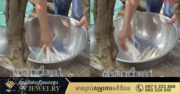 ស្ត្រីអ្នកលក់អាហាររូបនោះ បានចាប់យកបំពង់បឺតពីកញ្ច្រែង ដាក់ចូលទៅក្នុងចានដែកដែលមានទឹក រួចហើយកញ្ជ្រោកលាងបំពង់បឺតទាំងនោះតែមួយភ្លែត រួចហើយក៏ប្រមូលយកមកដាក់ក្នុងកញ្ច្រែងវិញ។