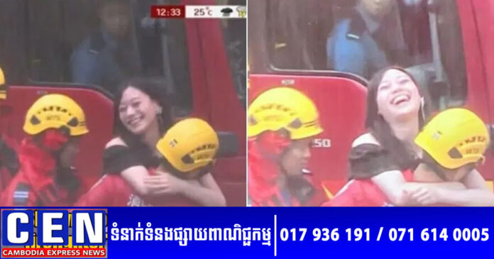 ជាមួយនឹងទឹកមុខញញឹមយ៉ាងរីករាយ នាងក៏ត្រូវបានគេមើលឃើញបានយកដៃរបស់នាងឱបរបស់អ្នកពន្លត់អគ្គីភ័យ ហើយថែមទាំងបានយកជើងរបស់នាង ក្រសោបចង្កេះរបស់គាត់ទៀតផង។ ទោះជាយ៉ាងណា វាមិនមែនជារឿងអ្វីត្រូវខ្មាសអៀននោះទេ គឺនាងឱបអ្នកពន្លត់អគ្គីភ័យប្រៀបដូចគូស្នេហ៍បែបនេះ ក៏ព្រោះតែនាងសប្បាយចិត្តខ្លាំង បន្ទាប់ពីត្រូវបានជួយសង្គ្រោះរួចផុតពីគ្រោះថ្នាក់ នៅក្នុងគ្រោះមហន្តរាយធម្មជាតិមួយនេះ។