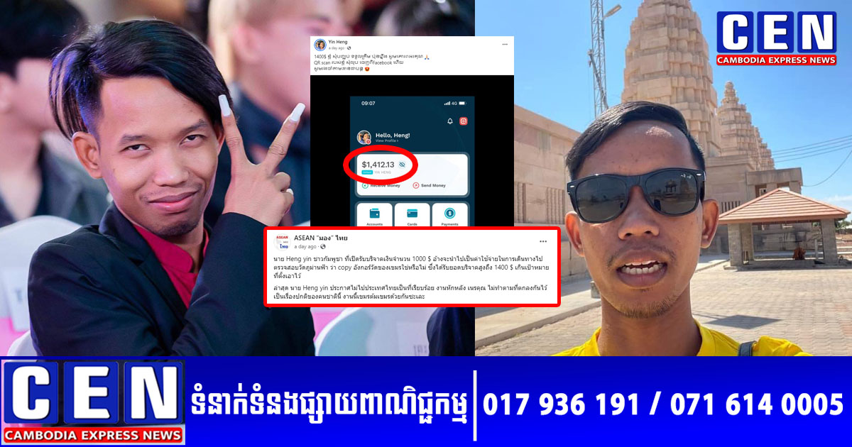 ជាក់ស្តែង ផេកថៃដែលមានឈ្មោះ «ASEAN “มอง” ไทย» កាលពីរសៀលថ្ងៃទី២៧ ខែកញ្ញា ឆ្នាំ២០២៣ បានបង្ហោះរូប ចំប៉ីខ្មៅ និងភ្ជាប់ Caption យ៉ាងដូច្នេះថា៖ «លោក ហេង យិន ជនជាតិខ្មែរ ដែលបានទទួលជំនួយឧបត្ថម្ភចំនួន 1000$ បានអះអាងថា ខ្លួននឹងប្រើប្រាស់សម្រាប់ចំណាយក្នុងការធ្វើដំណើរទៅពិនិត្យប្រាសាទភូម៉ានហ្វា ដើម្បីពិនិត្យមើលថាតើវាជាសំណង់ប្រាសាទចម្លងពីអង្គរ ដែលជាប្រាសាទរបស់ខ្មែរឬអត់។ ហើយបានទទួលជំនួយឧបត្ថម្ភសរុបចំនួន 1400$ លើសពីគោលដៅដែលបានកំណត់។ តែបន្ទាប់មក លោក ហេង យិន បែរជាបានប្រកាសមិនទៅប្រទេសថៃវិញទេ។ គាត់បានក្បត់ខ្លួនឯង គាត់ជាមនុស្សរមិលគុណ និងមិនបានធ្វើតាមការសន្យា។ នេះវាជារឿងធម្មតាទៅហើយ សម្រាប់ប្រជាជាតិមួយនេះ។ លើកនេះ ខ្មែរធ្វើស៊ីខ្មែរហើយ»៕ រក្សាសិទ្ធិដោយ៖ លឹម ហុង