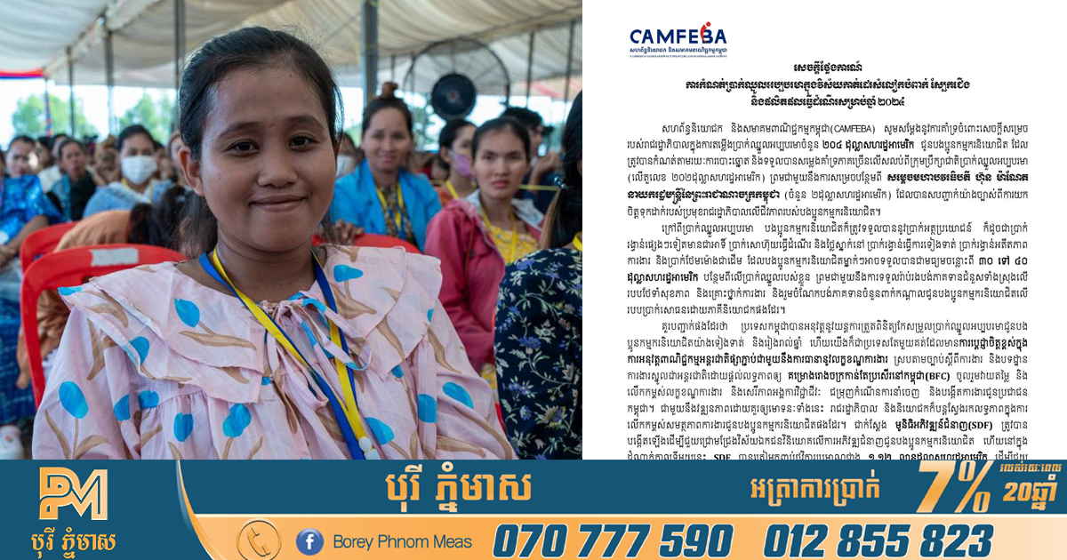 ភ្នំពេញ៖ សហព័ន្ធនិយោជក និងសមាគមពាណិជ្ជកម្មកម្ពុជា (CAMFEBA) បានចេញសេចក្តីប្រកាសគាំទ្រការដំឡើងប្រាក់ឈ្នួលអប្បបរមាចំនួន ២០៤ ដុល្លាសហរដ្ឋអាមេរិក ដែលជូនបងប្អូនកម្មករនិយោជិត ដោយបានសបញ្ជាក់យ៉ាងច្បាស់ពីការ យកចិត្តទុក ដាក់របស់ប្រមុខរាជរដ្ឋាភិបាលសម្តេចមហាបវរធិបតី ហ៊ុន ម៉ាណែត លើជីវភាពរបស់បងប្អូនកម្មករនិយោជិត។