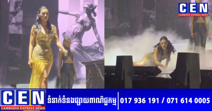 ពេលឡើងឆាកជាមួយតារាម៉ូដែល Lan Khue នាង Minh Tu បានស្លៀករ៉ូបរាត្រីពណ៌លឿង ដែលមានរាងខ្ពស់គួរឱ្យទាក់ទាញ។ តែអ្វីដែលធ្វើភ្ញាក់ផ្អើលខ្លាំងនោះ គឺគ្រាន់តែបោះជំហានឡើងដល់លើឆាក Minh Tu ស្រាប់តែជួបគ្រោះថ្នាក់ «រអិលជើង» ដួលមួយទំហឹងនៅលើឆាកតែម្តង។