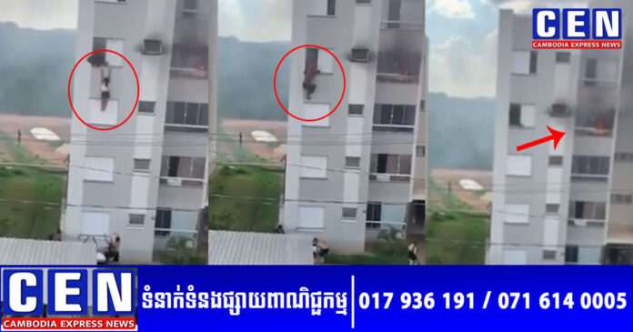 តាមរយៈវីដេអូដែលចែកចាយតាមប្រព័ន្ធអ៊ីនធឺណេត គេអាចមើលឃើញថា ដើម្បីជួយមនុស្សពីរនាក់រួចផុតពីភ្លើងនោះ ពលរដ្ឋល្អៗដែលរស់នៅក្បែរនោះ បានយកពូកចេញពីផ្ទះរបស់ពួកគេ ដើម្បីត្រៀមជួយសង្គ្រោះនៅក្រោម។ ភ្លាមៗនោះ ស្ត្រីជាប្រពន្ធអាយុ៥៣ឆ្នាំ បានលោតចុះពីលើយ៉មកលើពូក ហើយប្តីអាយុ៧០ឆ្នាំក៏លោតចុះមកតាមក្រោយ។