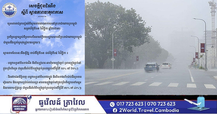 ភ្នំពេញ ៖ ក្រសួងធនធានទឹកនិងឧតុនិយម នៅថ្ងៃទី០៣ ខែវិច្ឆិកា ឆ្នាំ២០២៣ បានចេញប្រកាសព័ត៌មានពីស្ថានភាពធាតុអាកាស នៅព្រះរាជាណាចក្រកម្ពុជា ចាប់ពីថ្ងៃទី0៣ ដល់ថ្ងៃទី0៥ ខែវិច្ឆិកា ឆ្នាំ២០២៣។