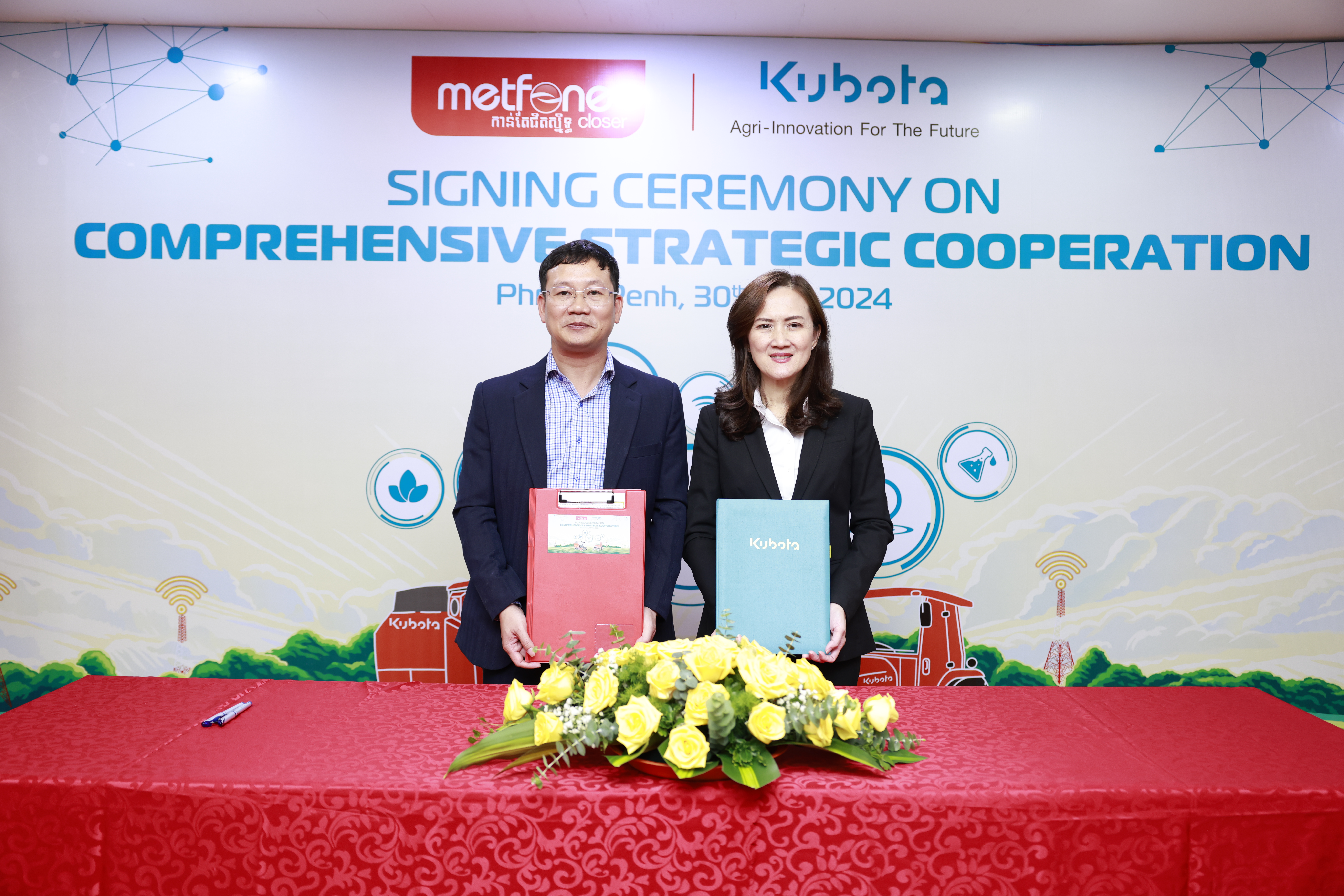 ភ្នំពេញ៖ នៅថ្ងៃទី 30 ខែកក្កដា នៅរាជធានីភ្នំពេញ ប្រទេសកម្ពុជា ពិធីចុះហត្ថលេខាលើកិច្ចព្រមព្រៀងកិច្ចសហប្រតិបត្តិការពាណិជ្ជកម្មទ្វេភាគីរយៈពេលបីឆ្នាំរវាងក្រុមហ៊ុន វៀតធេល ខេមបូឌា (Metfone) និង ក្រុមហ៊ុនស្យាមគូបូតា (Siam Kubota) ដែលជាការកត់សម្គាល់លើទំព័រថ្មីនៃភាពជាដៃគូរវាងក្រុមហ៊ុនទាំងពីរ។