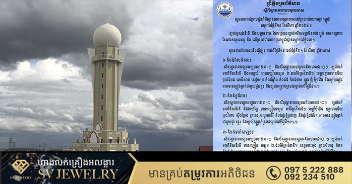 ភ្នំពេញ៖ ក្រសួងធនធានទឹក និងឧតុនិយម បានចេញសេចក្តីជូនដំណឹង អំពីស្ថានភាពធាតុអាកាសនៅកម្ពុជា សម្រាប់ថ្ងៃទី១៩ ខែសីហា ឆ្នាំ២០២៤ ៖ខ្យល់មូសុងនិរតី និងសម្ពាធទាប ដែលគ្របដណ្ដប់លើសមុទ្រចិនខាងត្បូង ភាគកណ្ដាល នៃអាងទន្លេមេគង្គ និង លើព្រះរាជាណាចក្រកម្ពុជាបានខ្សោយឥទ្ធិពល។