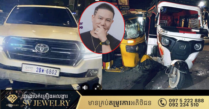 ភ្នំពេញ ៖ តារាចម្រៀង លោក ម៉ៃ សុគន្ធ បានបើករថយន្ដ ម៉ាកតូយ៉ូតា LAND CRUISER ពាក់ផ្លាកលេខ ភ្នំពេញ 2BW-6802 បើកគេចពីគោលដៅត្រួតពិនិត្យជាតិអាកុល រួចបើករត់រហូតជ្រុលទៅបុករះកង់បីឥណ្ឌាពីរគ្រឿង ហើយរ៉េចង្កូតបុករបាំងថ្មពុះចែកផ្លូវបន្ថែមទៀត ។