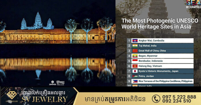 ភ្នំពេញ ៖ ក្រសួងទេសចរណ៍ បានឲ្យដឹងថា ប្រាសាទអង្គរវត្តនៃព្រះជាណាចក្រកម្ពុជា បានជាប់ចំណាត់ថ្នាក់លេខ១ ជាតំបន់បេតិកភណ្ឌពិភពលោករបស់អង្គការយូណេស្កូ ដែលមានសោភ័ណភាពស្រស់ស្អាតដាច់គេក្នុងទ្វីបអាស៊ី ចេញផ្សាយដោយ TimesTravel។ រក្សាសិទ្ធដោយ ៖ សុទ្ធលី