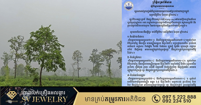 ភ្នំពេញ៖ ក្រសួងធនធានទឹក និងឧតុនិយម បានចេញសេចក្តីជូនដំណឹង អំពីស្ថានភាពធាតុអាកាសនៅកម្ពុជា សម្រាប់ថ្ងៃទី២៩ ខែតុលា ឆ្នាំ២០២៤ព្យុះទី២០ឈ្មោះត្រាមី(Trami) និងព្យុះទី២១ឈ្មោះកងរី(Kong-rey)នៅ មានឥទ្ធិពលខ្លាំងលើរបបខ្យល់មូសុងឦសាន ខណៈសម្ពាធទាបគ្របដណ្ដប់លើសមុទ្រចិនខាងត្បូង ឈូងសមុទ្រថៃ និងគ្របដណ្ដប់លើភាគខាងក្រោម នៃអាងទន្លេមេគង្គនិងលើព្រះរាជាណាចក្រកម្ពុជា ។