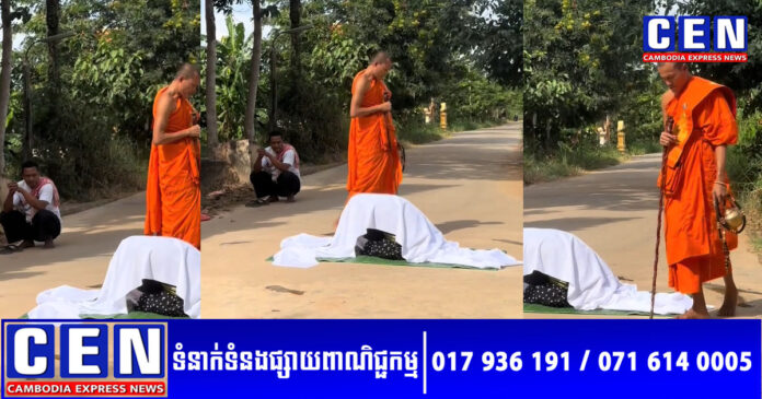 តាមរយៈវីដេអូ ដែលកំពុងរីករាលដាលនៅលើបណ្តាញសង្គម TikTok បានបង្ហាញមនុស្សរស់ ត្រូវបានគ្របក្រណាត់ស ប្រៀបដូចជាសាកសពរងគ្រោះក្នុងហេតុការណ៍គ្រោះថ្នាក់ចរាចរណ៍ ខណៈព្រះសង្ឃមួយអង្គ ធ្វើកិច្ចដ៏ចម្លែក ដើរក្រឡឹងជុំវិញ «សាកសពមនុស្សរស់» នោះ ដោយមានទាំងលោកតាអាចារ្យ ចូលរួមនៅក្នុងពិធីនេះ ដែលឃើញហើយគួរឲ្យព្រឺក្បាលតែម្តង។