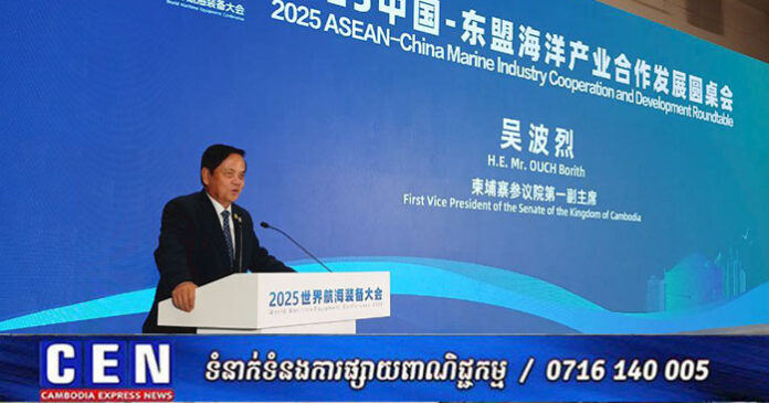 ក្រោយពីបានអញ្ជើញថ្លែងនៅក្នុងពិធីបើកសន្និសីទ ឯកឧត្តមអនុប្រធានទី១ ក៏បានអញ្ជើញបន្តថ្លែងសុន្ទរកថាបើកកិច្ចពិភាក្សាតុមូល ក្រោមប្រធានបទ “កិច្ចសហប្រតិបត្តិការ និងការអភិវឌ្ឍឧស្សាហកម្មសមុទ្រអាស៊ាន-ចិន ឆ្នាំ២០២៥”។ ក្នុងឱកាសនោះ ឯកឧត្តម បានជម្រាបជូនអ្នកចូលរួមអំពីអាទិភាពជាយុទ្ធសាស្រ្តរបស់កម្ពុជាពាក់ព័ន្ធនឹងវិស័យឧស្សាហកម្ម តាមរយៈការដាក់ចេញនូវ គោលនយោបាយអភិវឌ្ឍន៍វិស័យ ឧស្សាហកម្មកម្ពុជា ឆ្នាំ២០១៥-២០២៥ ដែលបានឆ្លុះបញ្ចាំងពីសារៈសំខាន់នៃការផ្លាស់ប្តូរបៃតង និងបរិវត្តកម្ម ឌីជីថល។ ឯកឧត្តម មានប្រសាសន៍ដោយសង្កត់ធ្ងន់ថា ភាពប្រកួតប្រជែងរយៈពេលវែងនៃវិស័យសមុទ្រ គឺអាស្រ័យទៅលើការធ្វើសមាហរណកម្មបច្ចេកវិទ្យានៃ ឧស្សាហកម្ម៤.០ តួយ៉ាង ស្វ័យប្រវត្តិកម្ម និងប្រព័ន្ធ