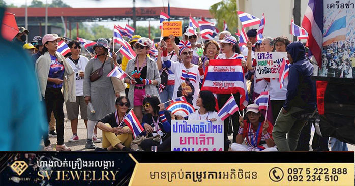 ស្របពេលកិច្ចប្រជុំកំពុងដំណើរការ ពលរដ្ឋថៃបានប្រមូលផ្តុំគ្នាប្រមាណ២០នាក់ នាំគ្នាស្រែកតវ៉ាប្រឆាំងកិច្ចប្រជុំ JBC នេះនៅខេត្តចន្ទបុរី ប្រទេសថៃ ហើយទីតាំងដែលពួកគេតវ៉ា ត្រូវបានយាមកាមដោយកម្លាំងតម្រួតរបស់ថៃជាច្រើនរូប៕រក្សាសិទ្ធដោយ៖សុទ្ធលី