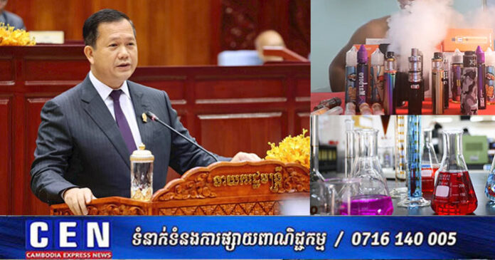 ភ្នំពេញ ៖ ប្រមុខរាជរដ្ឋាភិបាលកម្ពុជា សម្តេចមហាបវរធិបតី ហ៊ុន ម៉ាណែត បានចេញដាក់បទបញ្ជាហាមឃាត់ការនាំចូល ការចែកចាយ ការលក់ ការផ្សាយពាណិជ្ជកម្ម ការប្រើប្រាស់ ការកាន់កាប់ ការផលិត និងការស្តុកទុកឧបករណ៍អេឡិចត្រូនិក និងសារធាតុគីមីសម្រាប់ជក់ និងស៊ីស្សា គ្រប់ប្រភេទ និងគ្រប់ទម្រង់។