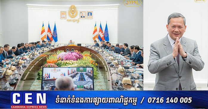 ភ្នំពេញ ៖ នាព្រឹកថ្ងៃសុក្រទី២៤ ខែតុលា ឆ្នាំ២០២៥ សម្តេចបវរធិបតី ហ៊ុន ម៉ាណែត នាយករដ្ឋមន្រ្តីនៃកម្ពុជា បានអញ្ជើញដឹកនាំកិច្ចប្រជុំពេញអង្គគណៈរដ្ឋមន្ត្រី នៅវិមានសន្តិភាព ដើម្បី ពិភាក្សា និងឆ្លងលើរបៀបវារៈដូចខាងក្រោម៖