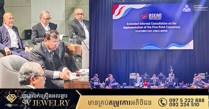 ប្រទេសម៉ាឡេស៊ី ៖ នៅរសៀលថ្ងៃទី២៤ ខែតុលា ឆ្នាំ២០២៥ ឯកឧត្តមឧបនាយករដ្ឋមន្ត្រី ប្រាក់ សុខុន រដ្ឋមន្ត្រីការបរទេស និងសហប្រតិបត្តិការអន្តរជាតិ បានអញ្ជើញចូលរួមកិច្ចពិគ្រោះយោបល់ក្រៅផ្លូវការក្នុងទម្រង់ពង្រីក នៅទីក្រុងគូឡាឡាំពួ ប្រទេសម៉ាឡេស៊ី។ កិច្ចពិគ្រោះយោបល់នេះបានគូសបញ្ជាក់ពីការប្តេជ្ញាចិត្តរបស់អាស៊ានចំពោះកិច្ចព្រមព្រៀងជាឯកច្ឆន្ទប្រាំចំណុច (5PC) ដើម្បីសន្តិភាព និងដំណោះស្រាយយូរអង្វែងនៅមីយ៉ាន់ម៉ា។