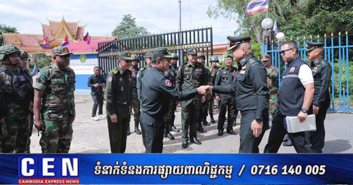 ច្រកទ្វារព្រំដែនអន្តរជាតិអូរស្មាច់ ៖ លោកជំទាវ ឧត្តមសេនីយ៍ឯក ម៉ាលី សុជាតា អ្នកនាំពាក្យក្រសួងការពារជាតិ នៃព្រះរាជាណាចក្រកម្ពុជា បានចេញសេចក្តីប្រកាសព័ត៌មានជម្រាបជូនសាធារណជន អ្នកសារព័ត៌មានជាតិ និងអន្តរជាតិមេត្តាជ្រាបថា៖ នៅថ្ងៃទី២៥ ខែតុលា ឆ្នាំ២០២៥ វេលាម៉ោង ១០:០០នាទីកាលពីព្រឹកមិញនេះ ឯកឧត្តម ឧត្តមសេនីយ៍ឯក ពៅ ហេង មេបញ្ជាការយោធភូមិភាគទី៤ នៃកងយោធពលខេមរភូមិន្ទ បានជួបពិភាក្សាការងារជាមួយ ឯកឧត្តម ឧត្តមសេនីយ៍ទោ វីរ៉ាក់យុទ្ធ រ៉ាក់ស៊ីង មេបញ្ជាការកងទ័ពភូមិភាគទី២ ថៃ នៅច្រកទ្វារព្រំដែនអន្តរជាតិអូរស្មាច់។