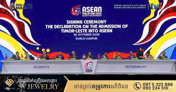 ប្រទេសម៉ាឡេស៊ី ៖ សាធារណរដ្ឋប្រជាធិបតេយ្យទីម័រខាងកើត ត្រូវបានប្រកាសបញ្ចូលជាសមាជិកអាស៊ានទី១១ ជាផ្លូវការ នាព្រឹកថ្ងៃទី២៦ ខែតុលា ឆ្នាំ២០២៥ នៅក្នុងកិច្ចប្រជុំកំពូលអាស៊ាន លើកទី៤៧ នៅរដ្ឋធានីគូឡាឡាំពួ ប្រទេសម៉ាឡេស៊ី៕ រក្សាសិទ្ធដោយ៖សុទ្ធលី