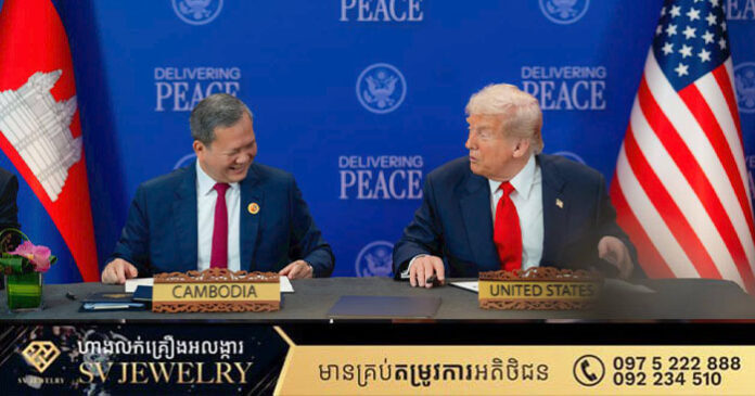 ១. «កិច្ចព្រមព្រៀងសន្តិភាព កម្ពុជា-ថៃ» ត្រូវបានចុះហត្ថលេខាដោយ សម្តេចមហាបវរធិបតី ហ៊ុន ម៉ាណែត នាយករដ្ឋមន្ត្រី នៃព្រះរាជាណាចក្រកម្ពុជា រួមជាមួយ ឯកឧត្តម Anutin Charnvirakul នាយករដ្ឋមន្ត្រី នៃព្រះរាជាណាចក្រថៃ ដោយមាន ឯកឧត្តម Donald J. Trump ប្រធានាធិបតី នៃសហរដ្ឋអាម៉េរិក រួមជាមួយ ឯកឧត្តម Anwar Ibrahim នាយករដ្ឋមន្ត្រី នៃប្រទេសម៉ាឡេស៊ី និងជាប្រធានអាស៊ាន ២០២៥ អញ្ជើញចុះហត្ថលេខាជាសាក្សី។
