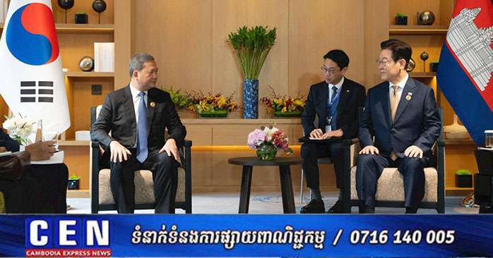 ទីក្រុងគូឡាឡាំពួ ៖ ព្រឹកថ្ងៃចន្ទ ទី២៧ តុលា ២០២៥ សម្តេចមហាបវរធិបតី ហ៊ុន ម៉ាណែត នាយករដ្ឋមន្រ្តីនៃព្រះរាជាណាចក្រកម្ពុជា បានអញ្ជើញជួបជាមួយ ឯកឧត្តម Lee Jae Myung ប្រធានាធិបតីនៃសាធារណរដ្ឋកូរ៉េ ក្នុងជំនួបទ្វេភាគី ពិភាក្សាការងារ។