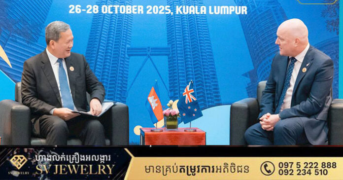 នាព្រឹកថ្ងៃទី២៧ ខែតុលា ឆ្នាំ២០២៥, សម្តេចមហាបវរធិបតី ហ៊ុន ម៉ាណែត នាយករដ្ឋមន្រ្តី នៃព្រះរាជាណាចក្រកម្ពុជា និង ឯកឧត្តម Christopher Luxon នាយករដ្ឋមន្ត្រី នូវែលហ្សេឡង់ បានជួបពិភាក្សាការងារទ្វេភាគី ក្នុងឱកាសចូលរួមកិច្ចប្រជុំកំពូលអាស៊ាន លើកទី៤៧ និងកិច្ចប្រជុំកំពូលពាក់ព័ន្ធ នៅទីក្រុងគូឡាឡាំពួ ប្រទេសម៉ាឡេស៊ី នៅថ្ងៃទី២៦-២៨ ខែតុលា ឆ្នាំ២០២៥។