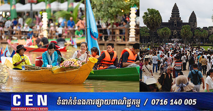 ទិដ្ឋភាពភ្ញៀវទេសចរជាតិ អន្តរជាតិ មកលេងកម្សាន្តនៅប្រាសាទអង្គរវត្ត ថ្ងៃទីមួយនៃព្រះរាជពិធីបុណ្យអុំទូក បណ្ដែតប្រទីប និងសំពះព្រះខែ អកអំបុក។
