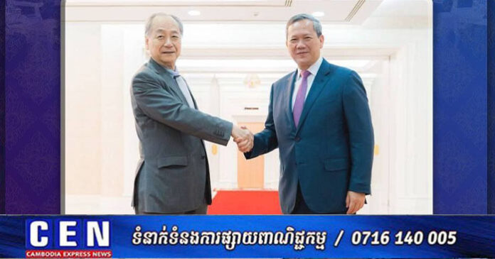 ភ្នំពេញ ៖ នាព្រឹកថ្ងៃទី១១ ខែវិច្ឆិកា ឆ្នាំ២០២៥, សម្តេចមហាបវរធិបតី ហ៊ុន ម៉ាណែត នាយករដ្ឋមន្ត្រី នៃព្រះរាជាណាចក្រកម្ពុជា បានអនុញ្ញាតឱ្យ ឯកឧត្តម តាកាហាស៊ី ហ្វូមីអាគី (TAKAHASHI Fumiaki) ប្រធានសមាគមជប៉ុន-កម្ពុជា និងគណៈប្រតិភូ ធុរជន ចូលជួបសម្ដែងការគួរសម និងពិភាក្សាការងារ នៅវិមានសន្តិភាព។