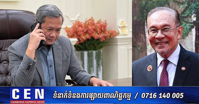 ភ្នំពេញ ៖ សម្តេចមហាបវរធិបតី ហ៊ុន ម៉ាណែត នាយករដ្ឋមន្រ្តីនៃព្រះរាជាណាចក្រកម្ពុជា បានមានប្រសាសន៍ថា ៖ «នារនារសៀលនេះ ខ្ញុំបានជួបពិភាក្សាតាមទូរសព្ទជាមួយ ឯកឧត្តម Anwar Ibrahim នាយករដ្ឋមន្ត្រីម៉ាឡេស៊ី ដើម្បីពិភាក្សាអំពីការបន្តស្វែងរកដំណោះស្រាយជម្លោះព្រំដែនកម្ពុជា-ថៃដោយសន្តិវិធី។ ខ្ញុំបានថ្លែងអំណរគុណ ឯកឧត្ដម Anwar ដែលបានបន្តដេីរតួនាទីយ៉ាងសំខាន់ និងសកម្មក្នុងការសម្របសម្រួល ស្វែងរកដំណោះស្រាយដោយសន្តិវីធីរវាងកម្ពុជា និងថៃ។