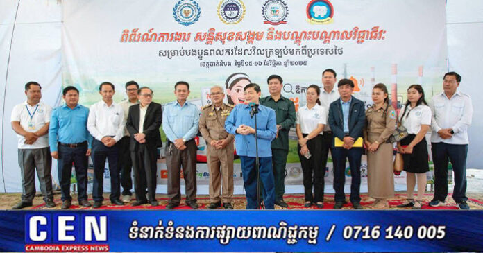 បាត់ដំបង ៖ ឯកឧត្ដម ហេង សួរ រដ្ឋមន្ត្រីក្រសួងការងារ និងបណ្ដុះបណ្ដាលវិជ្ជាជីវៈ បានបន្តអញ្ជើញជាអធិបតីក្នុងពិធីបើកពិព័រណ៍ការងារ សន្តិសុខសង្គម និងបណ្តុះបណ្តាលវិជ្ជាជីវៈ សម្រាប់បងប្អូនអតីតពលករដែលត្រឡប់មកពីប្រទេសថៃ ដោយនាំយកឱកាសការងារប្រមាណជាង ១,១ម៉ឺនកន្លែង និងព័ត៌មានស្តីពីអត្ថប្រយោជន៍នៃរបបសន្តិសុខសង្គម (ប.ស.ស.) និងការបណ្តុះបណ្តាលជំនាញបច្ចេកទេស និងវិជ្ជាជីវៈដោយឥតគិតថ្លៃ នៅព្រឹកថ្ងៃទី១៦ ខែវិច្ឆិកា ឆ្នាំ២០២៥នេះ នៅទីធ្លាសាធារណៈឃុំគារ ស្រុកមោងឫស្សី ខេត្តបាត់ដំបង ដែលរៀបចំដោយទីភ្នាក់ងារជាតិមុខរបរ និងការងារ (NEA) នៃក្រសួងការងារ និងបណ្តុះបណ្តាលវិជ្ជាជីវៈ រដ្ឋបាលស្រុកមោងឫស្សី សហភាពសហព័ន្ធយុវជនកម្ពុជា ខេត្តបាត់ដំបង វិស័យឯកជន សមាគមមិត្តយើង អ្នកផ្តល់ការអប់រំបណ្តុះបណ្តាល និងដៃគូពាក់ព័ន្ធផ្សេងទៀត ដែលមានអ្នកចូលរួម ១ ២០០នាក់។