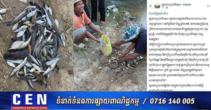 តាមរយៈបណ្តាញសង្គមនៅយប់ ថ្ងៃទី០៣ ខែធ្នូ ឆ្នាំ២០២៥ រដ្ឋបាលស្រុកទឹកផុស បានឲ្យដឹងថា នៅថ្ងៃពុធនេះ គេបានប្រទះឃើញត្រីងាប់ ក្នុងអូរមួយឈ្មោះថា អូរឬស្សី មានទីតាំងក្នុងភូមិតានៃ ឃុំជៀប ស្រុកទឹកផុស ខេត្តកំពង់ឆ្នាំង ។