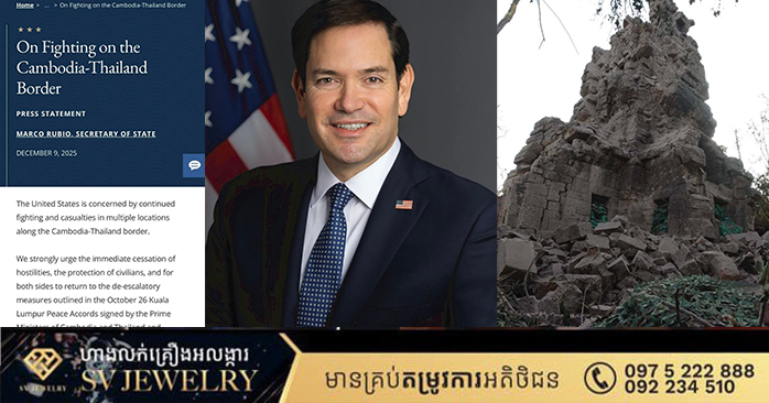 ភ្នំពេញ ៖ ក្រសួងការបរទេសអាមេរិក ចេញសេចក្តីប្រកាសជាផ្លូវការថា សហរដ្ឋអាមេរិក មានក្តីកង្វល់លើបញ្ហាជម្លោះ កម្ពុជា-ថៃ ដោយបានអំពាវនាវប្រទេសទាំងពីរបញ្ឈប់ទំនាស់ជាបន្ទាន់ ដើម្បីការការពារជនស៊ីវិល និងវិលត្រឡប់ទៅរកវិធានការកាត់បន្ថយភាពតានតឹង ដូចដែលបានគូសបញ្ជាក់នៅក្នុងកិច្ចព្រមព្រៀងសន្តិភាព នាថ្ងៃទី២៦ ខែតុលា ឆ្នាំ២០២៥ ដែលមានលោកប្រធានាធិបតី ដូណាល់ ត្រាំ និង នាយករដ្ឋមន្ត្រី ម៉ាឡេស៊ីលោក Anwar Ibrahim ជាសាក្សី៕ រក្សាសិទ្ធដោយ៖សុទ្ធលី