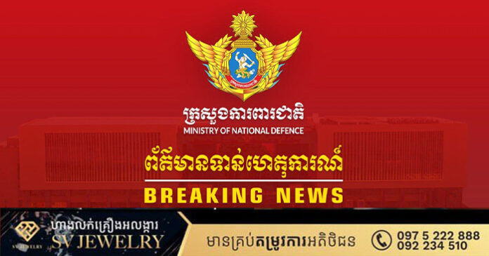 ភ្នំពេញ ៖ ក្រសួងការពារជាតិ សូមជម្រាបជូននូវស្ថានការណ៍នៅតាមបន្ទាត់ព្រំដែនកម្ពុជា-ថៃ អំពី ករណីយោធាថៃ បានធ្វើសកម្មភាព និងបើកការបាញ់ប្រហារមកក្នុងដែនអធិបតេយ្យស្របច្បាប់របស់កម្ពុជា នៅក្នុងភូមិសាស្រ្តយោធភូមិភាគទី៤ ក្នុងខេត្តព្រះវិហារ និងខេត្តឧត្តរមានជ័យ នៅព្រឹក ថ្ងៃទី១០ ខែធ្នូ ឆ្នាំ២០២៥ គិតត្រឹមម៉ោង ១០:១៣នាទី។