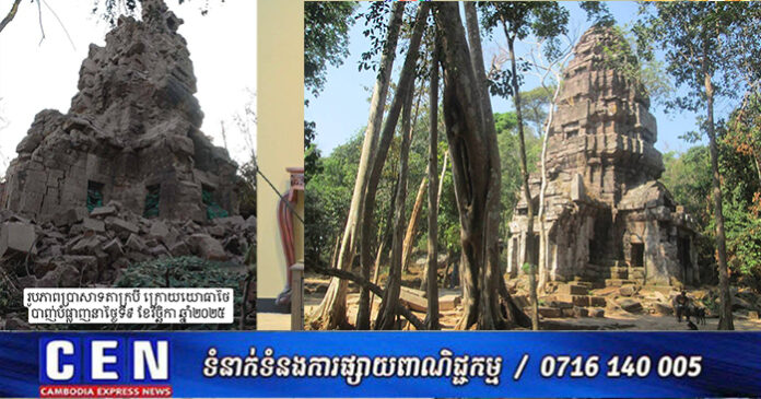 ភ្នំពេញ ៖ បន្ទាប់ពីទទួលរងការបាញ់បំផ្លាញយ៉ាងធ្ងន់ធ្ងរពីសំណាក់យោធាថៃកាលពីថ្ងៃទី៨-៩ ខែធ្នូ ឆ្នាំ២០២៥ ប្រាសាទតាក្របី ជាទីសក្ការៈរបស់កម្ពុជា បន្តទទួលរងការបាញ់កម្ទេចជាថ្មី បណ្តាលឱ្យរូបរាង និងរចនាសម្ព័ន្ធប្រាសាទត្រូវបានបំផ្លាញទាំងស្រុង នាថ្ងៃទី១០ ខែធ្នូ ឆ្នាំ២០២៥ ទោះជាក្រសួងវប្បធម៌និងវិចិត្រសិល្បៈបានអំពាវនាវរួចហើយក៏ដោយ។