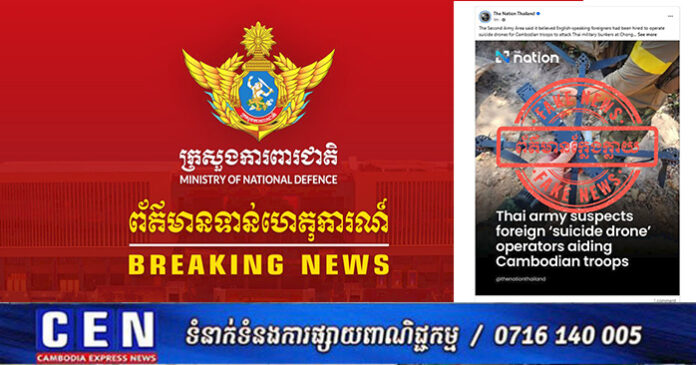ភ្នំពេញ ៖ ការផ្សព្វផ្សាយរបស់សារព័ត៌មាន The Nation Thailand ដែលបានចោទប្រកាន់ថាកម្ពុជា ប្រើប្រាស់ទាហានស៊ីឈ្នួលបរទេសមកជួយបង្ហោះដ្រូនអត្តឃាតក្នុងជម្លោះព្រំដែនកម្ពុជា-ថៃ។ ក្រសួងការពារជាតិកម្ពុជា សូមទាត់ចោល នូវខ្លឹមសារដែលបានចុះផ្សាយក្នុងសារព័ត៌មានថៃខាងលើនេះ និងសូមអះអាងថាជាព័ត៌មានភូតកុហុក និងជាព័ត៌មានប្រឌិត ក្លែងក្លាយ និងលាបពណ៌មកលើកម្ពុជាតែប៉ុណ្ណោះ។
