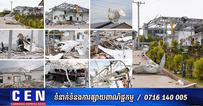 ផ្ទះសម្បែងរបស់ប្រជាពលរដ្ឋ និងអគារស្នាក់នៅរបស់អ្នកវិនិយោគជាជនជាតិចិនជាដើម បានរងការបាក់បែក និងខូចខាតដោយសារទម្ងន់គ្រាប់របស់កងទ័ពថៃ៕រក្សាសិទ្ធដោយ៖សុទ្ធលី
