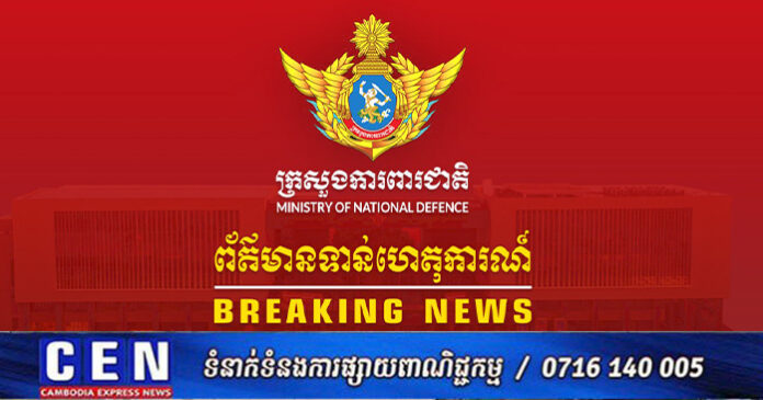ភ្នំពេញ ៖ ក្រសួងការពារជាតិ បានឲ្យដឹងថា ថ្ងៃទី១៣ ធ្នូ ២០២៥ កងទាហានថៃ កំពុងប្រើប្រាស់យន្តហោះចម្បាំងF-16 ចំនួន ២គ្រឿង ទម្លាក់គ្រាប់បែកចំនួន៧គ្រាប់ គោលដៅដូចខាងក្រោម៖