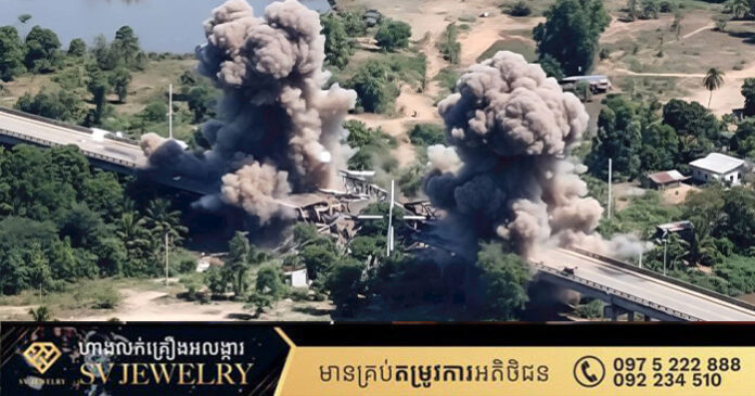 ក្រសួងការពារជាតិ ទាមទារឱ្យថៃបញ្ឈប់ជាបន្ទាន់ការបាញ់ប្រហារដោយមិនរើសគោលដៅ ការប្រើប្រាស់ យន្តហោះចម្បាំងហោះចូលក្នុងទឹកដីកម្ពុជា ដែលមិនត្រឹមតែជាការរំលោភបំពានដ៏ធ្ងន់ធ្ងរបំផុតលើ អធិបតេយ្យ បូរណភាពទឹកដីកម្ពុជា និងច្បាប់អន្តរជាតិប៉ុណ្ណោះទេ ប៉ុន្តែថែមទាំងបានផ្លោង និងទំលាក់គ្រាប់បែក ដោយមិនរើសអើង និងមិនសមមាត្រ ហើយបានធ្វើឱ្យគ្រោះថ្នាក់ដល់អាយុជីវិត និងសុវត្ថិភាពរបស់ប្រជាជនស៊ីវិលស្លូតត្រង់កម្ពុជា និងបំផ្លិចបំផ្លាញដល់ទ្រព្យសម្បត្តិ ហេដ្ឋារចនាសម្ព័ន្ធស៊ីវិល និងប្រាសាទបុរាណជាទីសក្ការៈ ដែលជាមរតកមនុស្សជាតិ ដូចជា៖ សាលារៀន មន្ទីពេទ្យ វត្តអារ៉ាម ផ្ទះសម្បែង ផ្សារ ប្រាសាទព្រះវិហារ ប្រាសាទតាក្របី និងទីតាំងសាធារណៈជាច្រើនរាប់មិនអស់។