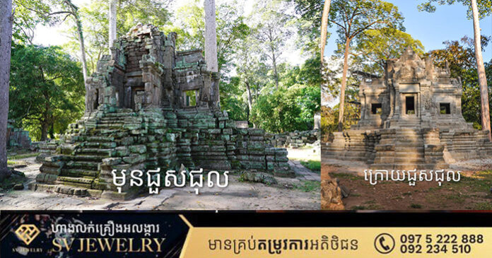 សូមបញ្ជាក់ថា មុនការជួសជុល ប្រាសាទជមមានស្ថានភាពទ្រុឌទ្រោមខ្លាំង ដោយសារអាយុកាលនៃសំណង់ កត្តាធម្មជាតិ និងមានឫសឈើចាក់បំបែករចនាសម្ព័ន្ធរបស់ប្រាសាទ រហូតដល់គ្រឹះខាងក្រោម ការនេះធ្វើឱ្យដីគ្រឹះចុះខ្សោយ និងស្រុតចុះ។ ដើម្បីជួសជុលប្រាសាទនេះ ក្រុមការងារបានរើថ្មប្រាសាទនេះទាំងអស់ រួចរៀបផ្គុំឡើងវិញ និងបានស្វែងរកថ្មដែលបានបាត់ មកដាក់នៅទីតាំងដើមវិញ ដូចជាផ្តែរ សសរពេជ្រ និងស៊ុមទ្វារផ្នែកខាងក្រៅជាដើម៕ រក្សាសិទ្ធដោយ៖សុទ្ធលី