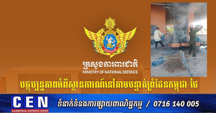 ភ្នំពេញ ៖ ក្រសួងការពារជាតិ បានចេញរបាយការណ៍សង្ខេបស្ថានការណ៍នៅតាមបន្ទាត់ព្រំដែនកម្ពុជា-ថៃ អំពីករណីកងកម្លាំងយោធាថៃបន្តការបាញ់ប្រហារ និងឈ្លានពានមកលើដែនអធិបតេយ្យកម្ពុជានៅទិសយោធភូមិភាគទី៤ និងយោធភូមិភាគទី៥