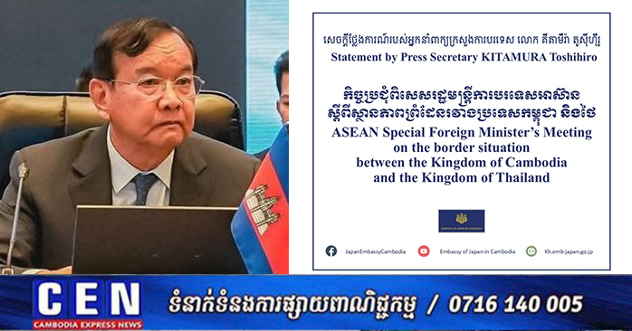 ភ្នំពេញ ៖ សេចក្តីថ្លែងការណ៍របស់អ្នកនាំពាក្យក្រសួងការបរទេស : កិច្ចប្រជុំពិសេសរដ្ឋមន្ត្រីការបរទេសអាស៊ាន ស្តីពីស្ថានភាពព្រំដែនរវាងប្រទេសកម្ពុជា-ថៃ។