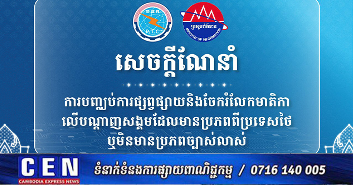 ក្នុងន័យនេះ ក្រសួងប្រៃសណីយ៍និងទូរគមនាគមន៍ និងក្រសួងព័ត៌មាន សូមសាធារណជន បញ្ឈប់ រាល់ការផ្សព្វផ្សាយបន្តនិងចែករំលែកមាតិកាដែល មានប្រភពពីប្រទេសថៃ ឬមិនមានប្រភពច្បាស់លាស់ដោយត្រូវ៖