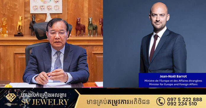 នៅរសៀលថ្ងៃទី២៣ ខែធ្នូ ឆ្នាំ២០២៥ ឯកឧត្តម ប្រាក់ សុខុន ឧបនាយករដ្ឋមន្ត្រី រដ្ឋមន្រ្តីក្រសួងការបរទេស និងកិច្ចសហប្រតិបត្តិការអន្តរជាតិ បានសន្ទនាតាមទូរស័ព្ទជាមួយ ឯកឧត្តម Jean-Noël BARROT រដ្ឋមន្រ្តីនៃក្រសួងអឺរ៉ុប និងការបរទេស នៃសាធារណរដ្ឋបារាំង។