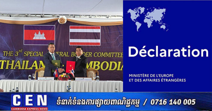 ក្រសួងអឺរ៉ុប និងការបរទេសបារាំង បានចេញសេចក្តីថ្លែងការណ៍ស្វាគមន៍ប្រទេសកម្ពុជា/ថៃ-ការចូលជាធរមាននៃបទឈប់បាញ់(ថ្ងៃទី២៧ ខែធ្នូ ឆ្នាំ២០២៥)។